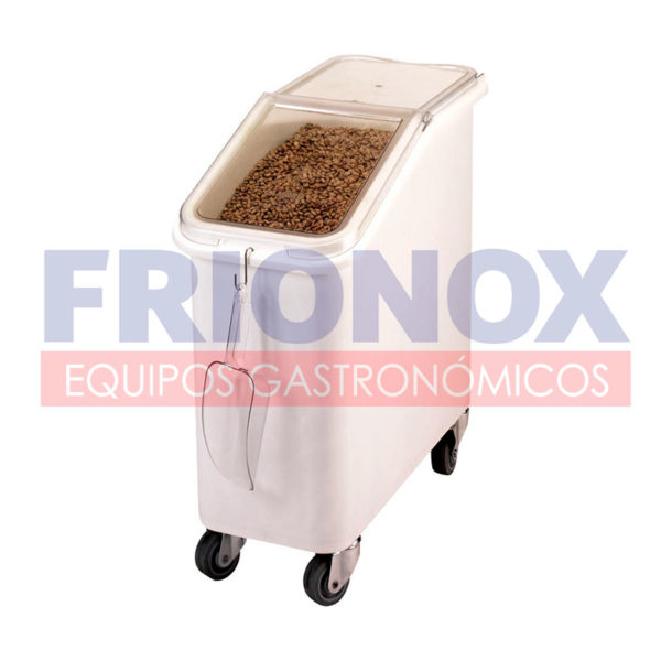 Carro de ingredientes con tapa inclinada. Capacidad 102 L. Capacidad de carga: 103 kg (azúcar), 68 kg (harina). Con tapa deslizante, higiénica y transparente, que reduce el manejo de los ingredientes y permite identificar rápidamente el contenido. Con 2 ruedas fijas y dos giratorias, de 7,6 cm. Ø.